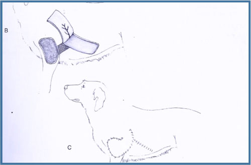 The problem with a lump this size is that there is not enough skin on the elbow to allow skin coverage of the removed lump; it requires a specialized skin graft. Below is a representation of a lateral thoracic axial pattern flap. Dr. Yoder performed this procedure to take extra skin from the chest wall, and rotate it to cover up the elbow skin deficit.